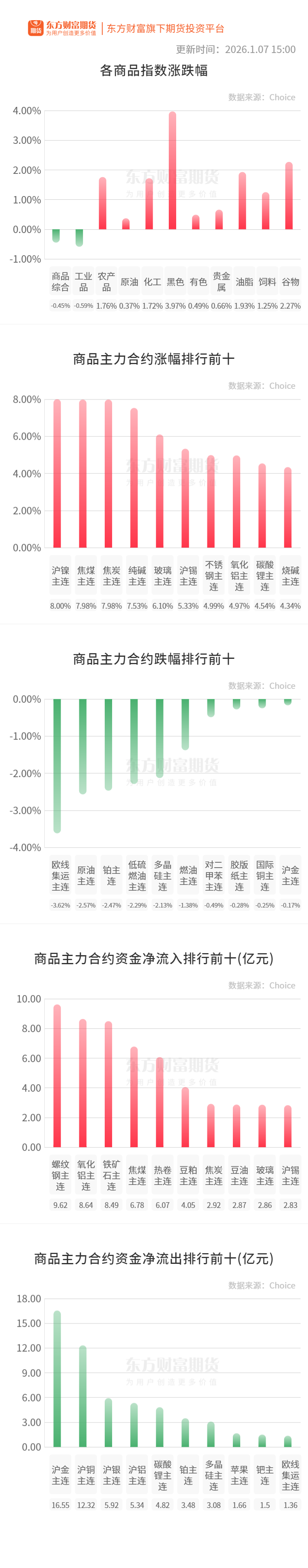 钢材:截止1月7日当周,据找钢网数据显示,全国重点钢材品种产量、库存如下:全国建材数据产量445.32万吨,较上周减少4.96万吨;厂库395.1万吨,较上周增加16.05万吨;社库343.99万吨,较上周减少6.06万吨;总库存739.09万吨,较上周增加15.39万吨;表需429.93万吨,较上周减少37.54万吨。(找钢网)