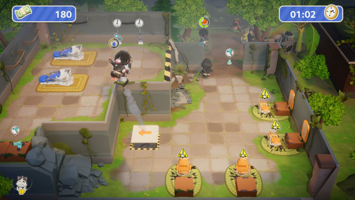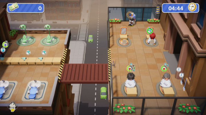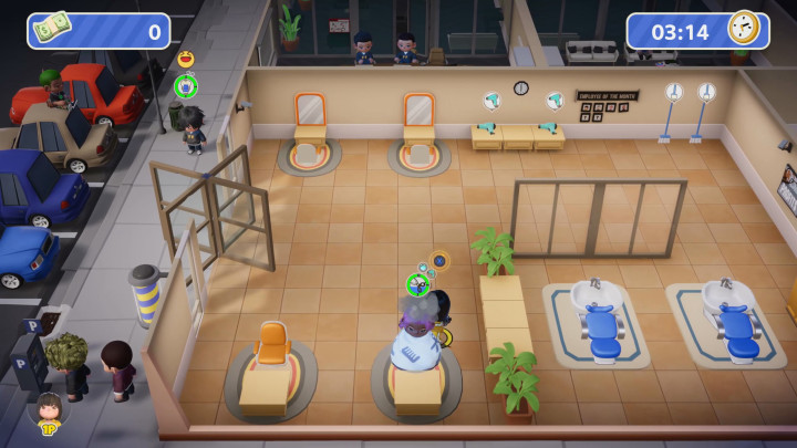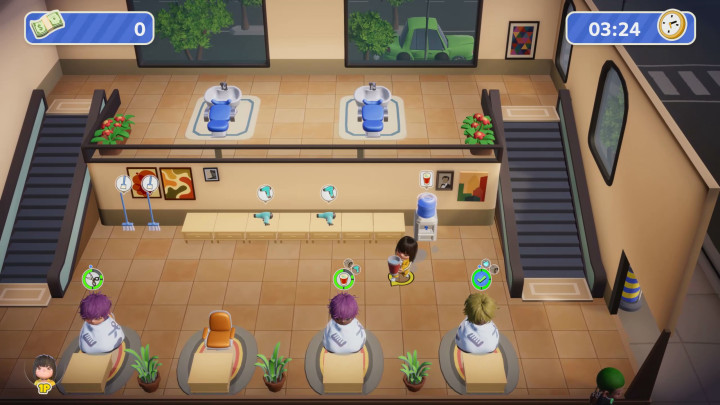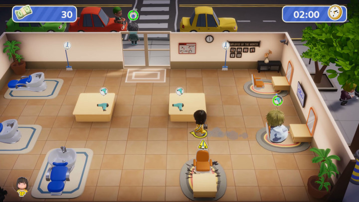 当然,虽说我分享了这么多心得,但相信你已经察觉到了,正如现实中发廊运营需要足够人手一样,《乱剪一通》想要达成所有地图都三星完美通关,最有力武器就是跟你一起合作的伙伴。本作支持本地同屏或者网络联机,允许玩家组建最多四人的美发团队。在赚取奖金之后又能解锁新的可选角色与服装,不同角色也有特色技能,比如女发型师凯利在每次完成客户需求之后,都可以获得五秒钟移速加成,而来自喵星的发型师喵可,却可以通过打顾客来回复满意度——也许制作组觉得如果发廊里养一只可爱的喵星人,可以降低顾客对于长时间等待的不耐烦情绪吧。所以在联机游戏的时候,如果玩家们能够巧妙搭配团队技能,在合适岗位上发挥各自的特长,工作效率一定更加事半功倍。