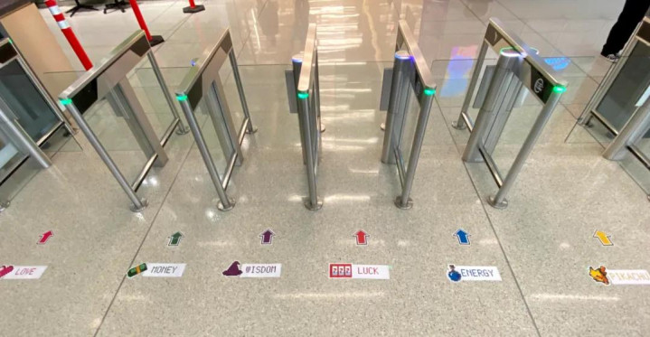 他们曾做过一个叫有趣的干预(Playful Intervention)的项目,任务是改造教学楼大厅。团队观察到,因为大厅最左边的电子门离保安和出口最近,几乎所有人都习惯性地只走那扇门。为了引导人流,团队设计了一套低成本方案,在每扇门前贴上不同的标识。