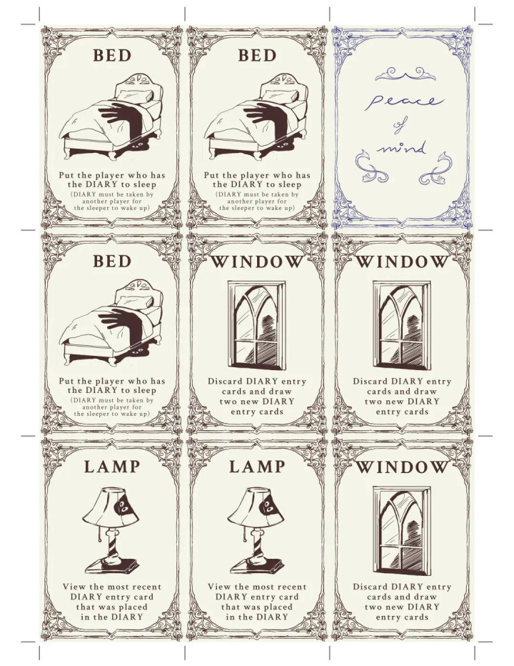 在这个机制下,桌子中央放置了一个日记盒子,各阵营玩家的目标是将代表自己阵营的日记牌放入其中。原著中的家具则作为功能牌,比如床代表睡觉,如果对玩家使用床,他就被迫进入休息状态,无法在本回合往日记里放牌。